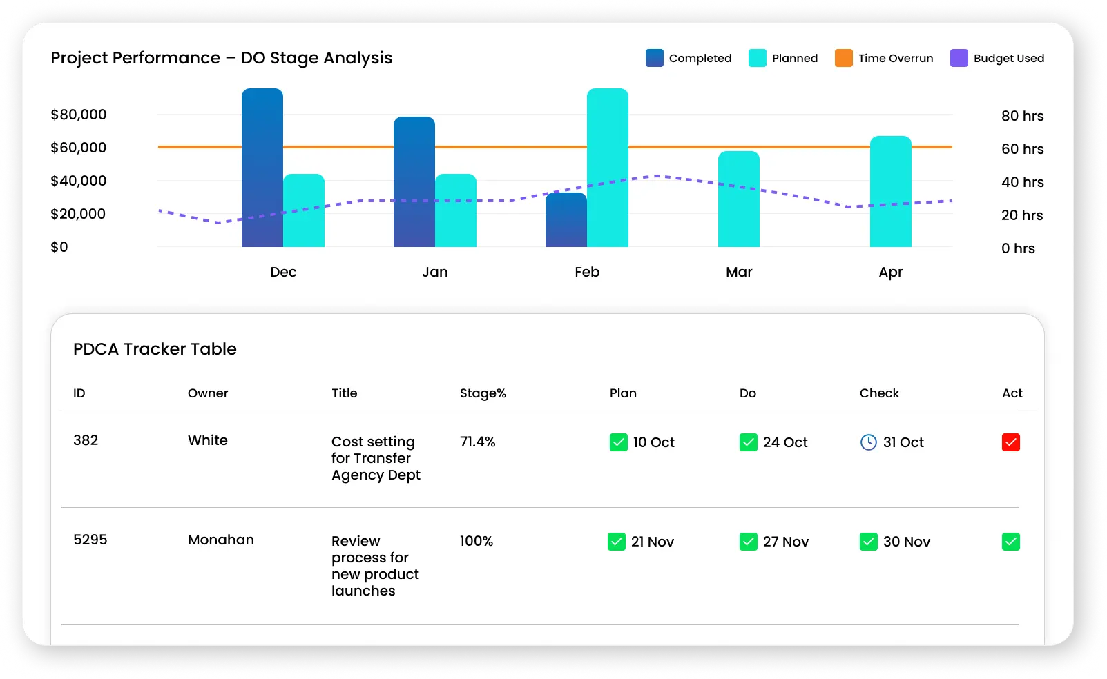 Monitor KPIs with real-time dashboards, bowler charts, and Pareto analysis.