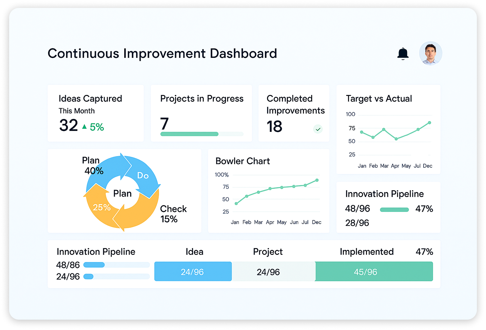 Monitor KPIs with real-time dashboards, bowler charts, and Pareto analysis.