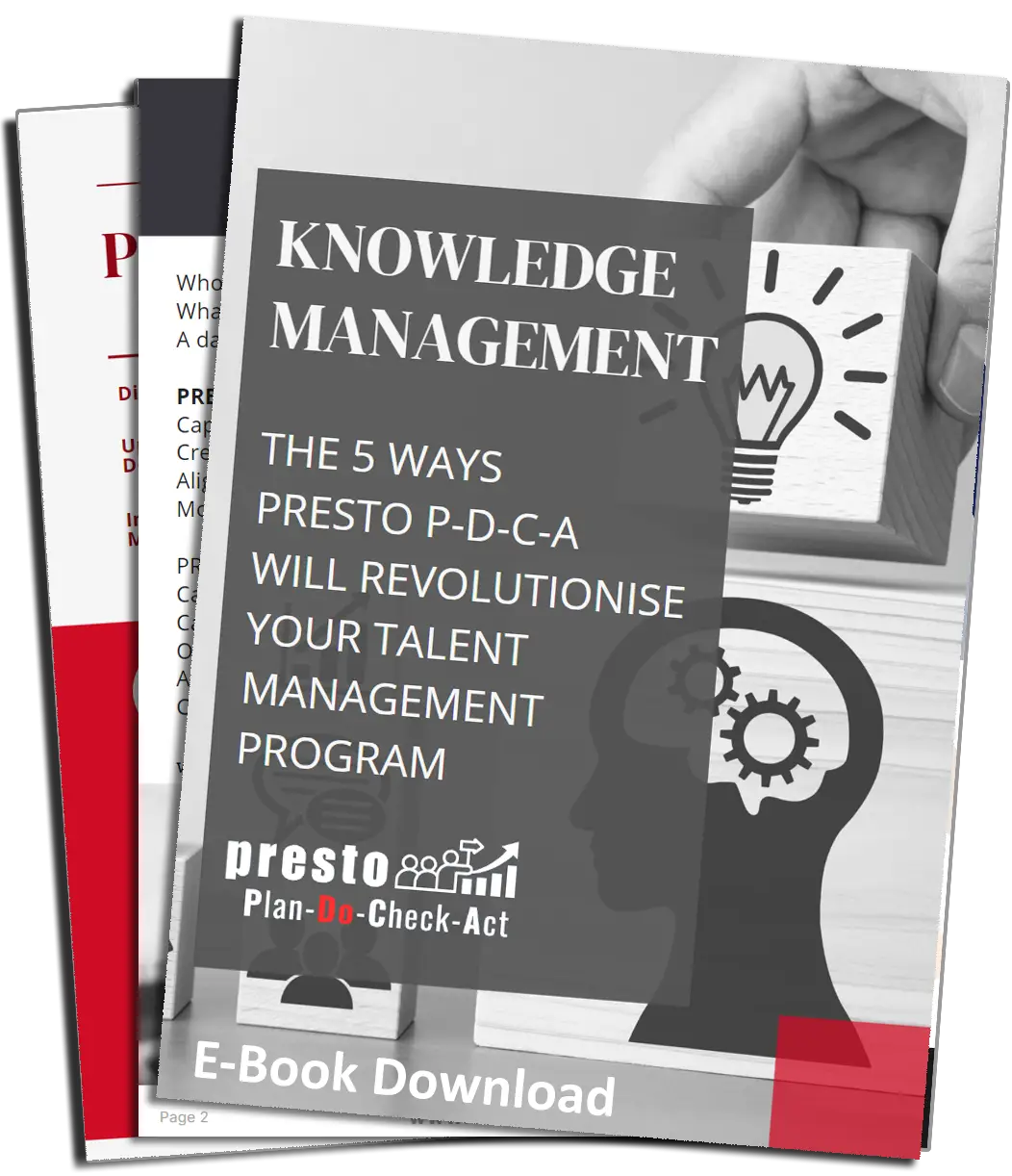 Discover the 5 key focus areas of digital transformation success in knowledge management & talent retainment using PRESTO P-D-C-A! This job aid unveils the top 5 essential areas of talent management that must be your top priority to achieve a seamless transformation. Learn how PRESTO P-D-C-A can support and empower your organisation to thrive in today’s ever-changing digital landscape. Don’t wait any longer to unlock the full potential of your business – get started with PRESTO P-D-C-A today!